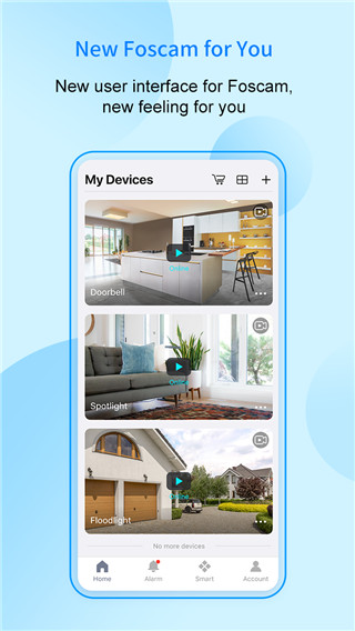 foscam摄像头app是一款手机智能监控软件。该软件重新设计了UI和界面架构,为用户提供更清爽直观的操作体验。与其他监控软件相较而言,该软件的主要优势在于产品快速简易的连接和清晰快速的的图像传输能力,这极大地提升用户体验。同时新产品新功能快速迭代以及自有云的数据分析,保证了产品的安全和稳定性,为你提供安全可靠的安防监控功能,更为用户提供优质服务。
