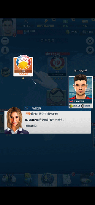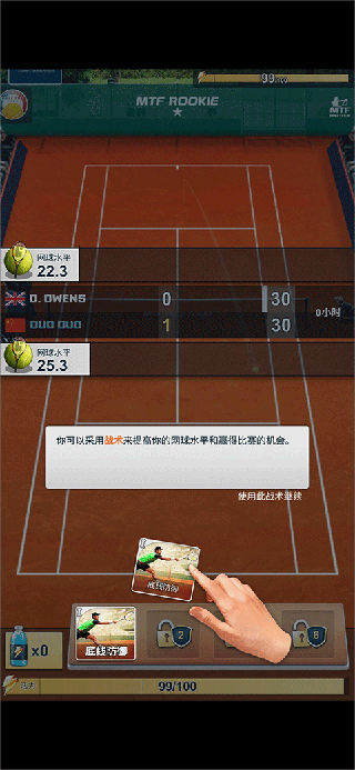 获取经验并学习赛事技巧,例如发球和截击,基线防御,杰作等等