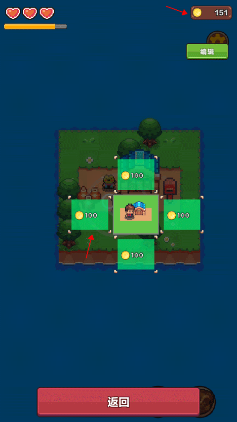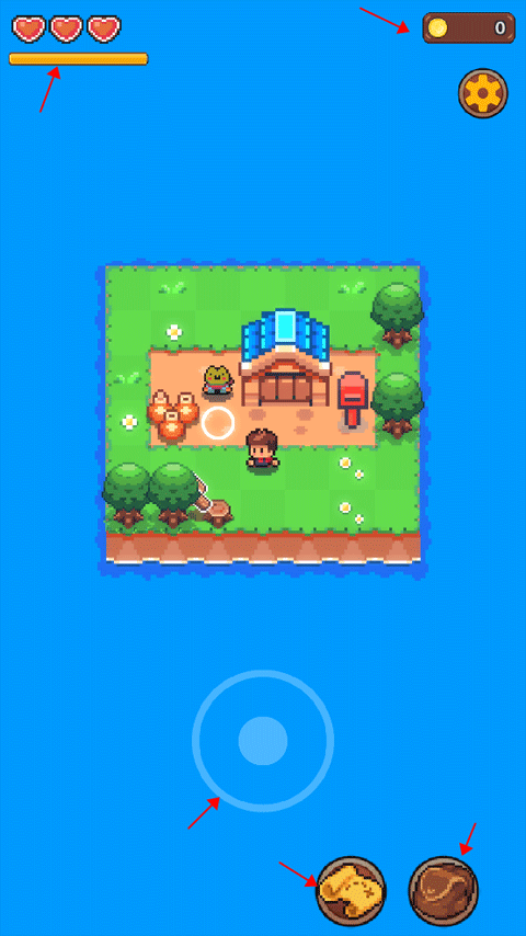 2、游戏最初的状态就是在一小块小岛上,小岛下方的圆圈图标是用来控制角色的移动方向,右下方的地图图标是用金币来扩大自己的岛屿面积的;书包图标是用来装东西,同样也能出售物品换取金币,左上角的爱心和进度条是表示角色的体力和能量,右上角的金币目前为零。