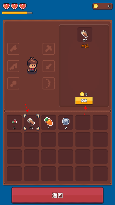 5、当你将所有的物资都放入到书包里面,你可以选中其中一个物资,右边的框框出现了卖出这个功能,重复点击“卖出”,你的金币数量就会不断上升。