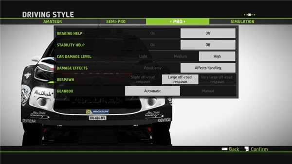 半职业:开启刹车辅助、关闭稳定辅助、开启中等车损、开启车损影响操控、开启轻微偏离马上回到赛道上以及开启自动波。