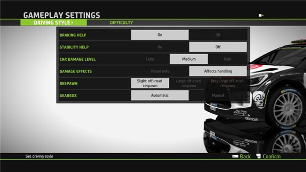 拟真:关闭刹车辅助、关闭稳定辅助、开启高度车损、开启车损影响操控、开启最大偏离马上回到赛道上以及开启手动挡。