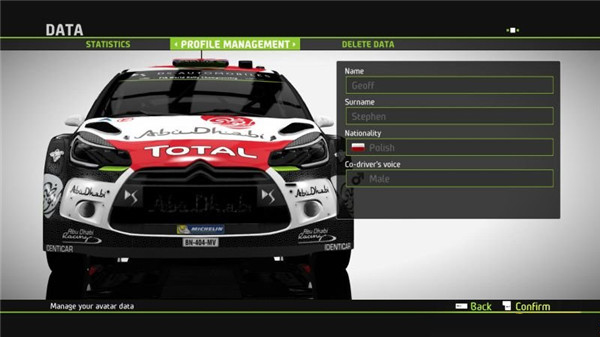 账号管理:修改玩家车手的名字、国籍以及领航员的声线(可选择男或女)。