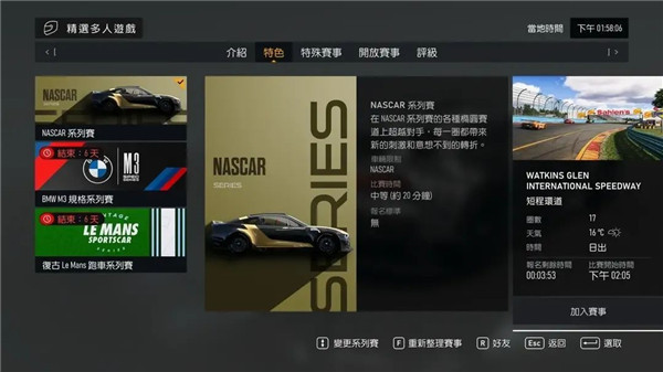 一般特色赛事有三个,第一个是一个版本更新一次,后两个是每周四更新一次。这类赛事都是统规赛(不允许修改车辆性能分),但是可以自己更改调教参数。这类赛事每周都有不同的车辆,还是很有意思的。你甚至可以看见用纳斯卡跑银石,勒芒原型车跑纽北。