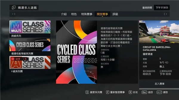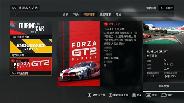 这个赛事是高手最多的赛事,你可能经常看见职业哥搞团建。这个赛事有三个:1、tcr房车 2、耐力赛 3、GT3/GT2。都是每周四更新,推荐常玩这些赛事,你的驾驶水平会飞速上涨。