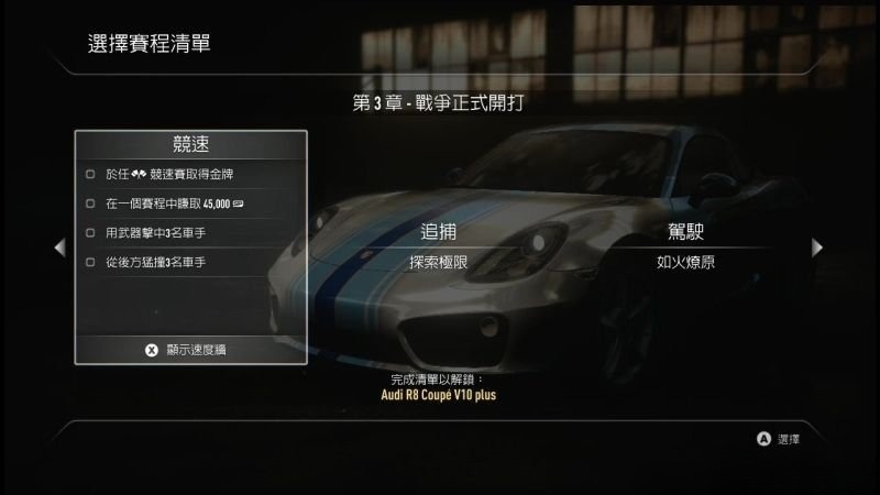 注:玩家可以选择自己的偏好来完成游戏流程,即便是选择单个车手模式都可以开启所有的章节及车辆。