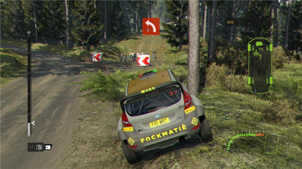 车速表:屏幕右下角会显示出车速表,当中包含了转速、车速和档位,拉力赛的车转速最高只有6000转,而KMPH(英里/小时)是车速的单位,而最大的数字就是档位,倒车是R档。