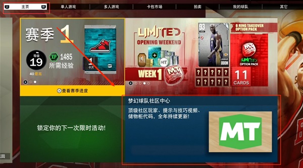1、在梦幻球队(MT模式)的主界面,进入到右下角的社区中心。