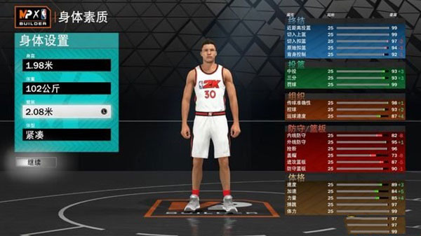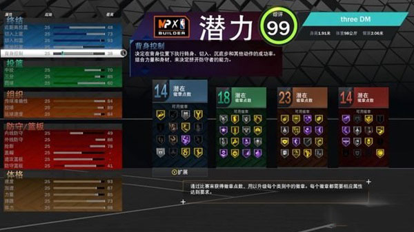 1、本作的建模菜单采用了《2K22 次世代》的建模方式,通过调整球员的身体数据以决定各项能力所能抵达的上限。