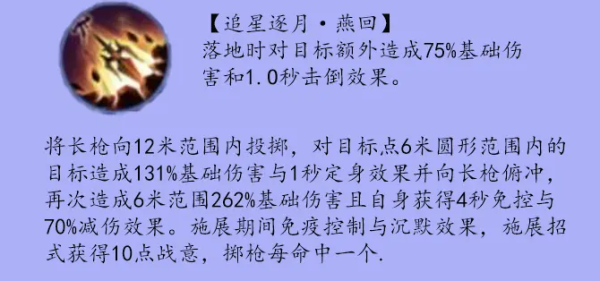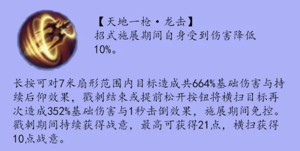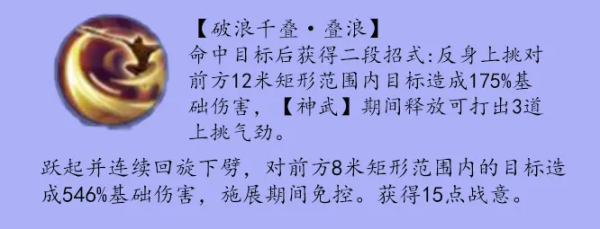 点评:短距离伤害,免控技能。可获得15点战意,一般需要在神武状态使用反杀概率大,前期只是作为伤害技能,耗血使用。