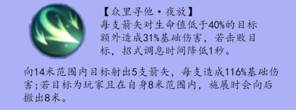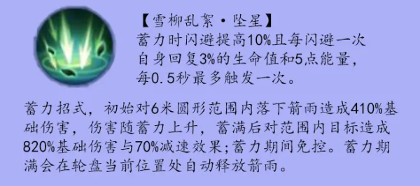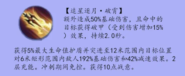 点评:对于血量低于40%造成额外伤害,表示了这个技能一般用于连招中段或者后段,连招过后在次拉开距离,给与一定的输出距离,利用距离优势可风筝敌人血量。