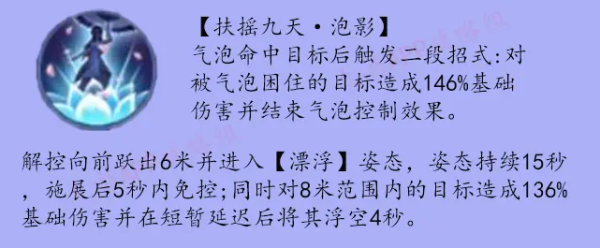 点评:可解控进入漂浮状态,并浮空,造出伤害和免控,技能效果是比较全面的,还能在高处一般技能打不到的。