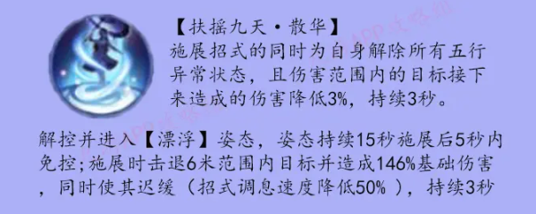 ②逍遥:【漂浮】姿态下自身造成的伤害和治疗效果提高9%且不会受到减速的影响。