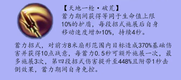 点评:破甲加伤害,还能眩晕敌人,并且对于生命值低于40%的敌人会造成额外的伤害,因此也决定了本技能一般用于技能连接的中段或者尾段,开启战意状态小怪更佳。