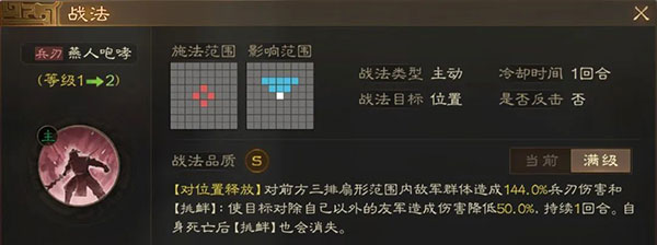 作为一个武力值成长不错的骑兵,颜良不怕反击的特点使其可以首回合无所顾忌地输出,再加上自身战法使得颜良可以在攻击对面武将的同时将对方武将眩晕住,从而暂时性对敌方造成减员。