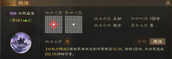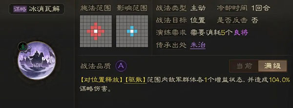 卢植想必大家都很熟悉了,自带战法【决胜庙堂】帮助队友提高输出,其实本身的谋略伤害量也是非常可观的。携带【冰消瓦解】也是个A级战法,驱散加输出,在遭遇曹仁等保护性武将的敌方时,驱散的收益绝对比单纯输出要高。