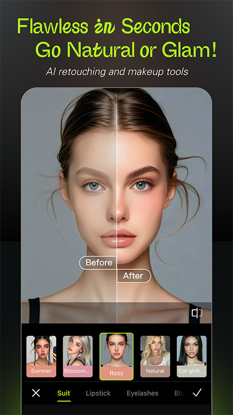 -修饰工具:多种修饰工具可以对您的自拍的各个方面进行自然和精确的调整,包括平滑皮肤、面部调整、身体调整和造型。