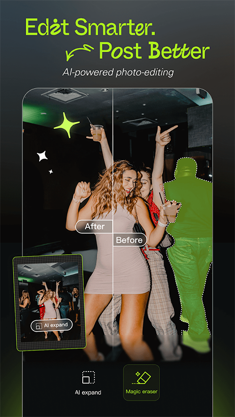 - AI清理:只需一次点击即可擦除照片背景。使用人工智能,平滑地移除图像中任何不需要的对象。