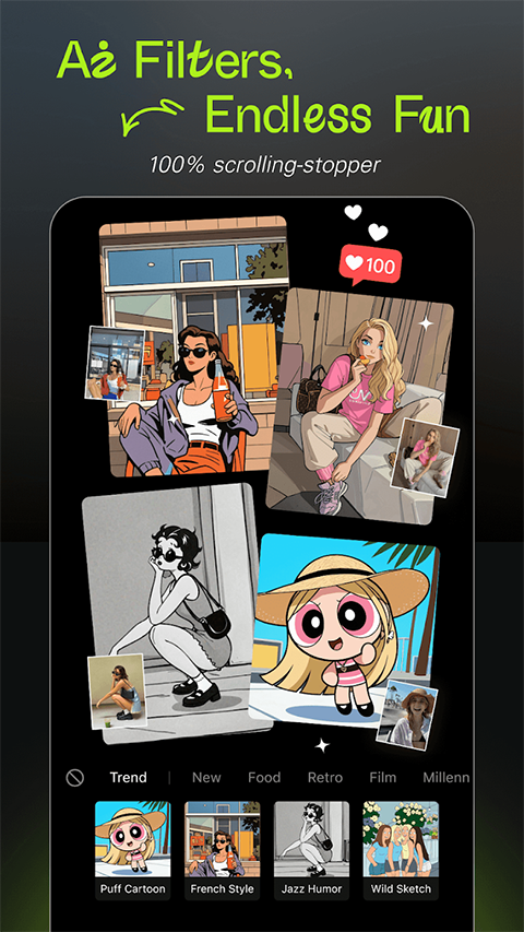 -人工智能滤镜:尝试不同的人工智能滤镜,以不同的审美方式来看待自己,如漫画、赛博朋克、复古、卡通、PS2风格。你还可以为你的宠物获得个性化的AI头像。