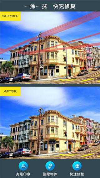 1、快速修复:只需标记图片中不想要的物体,就能让它们从中消失,触摸细小瑕疵,永久删除。快速修复美观图片。