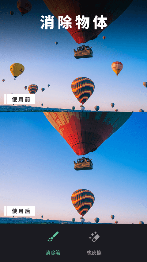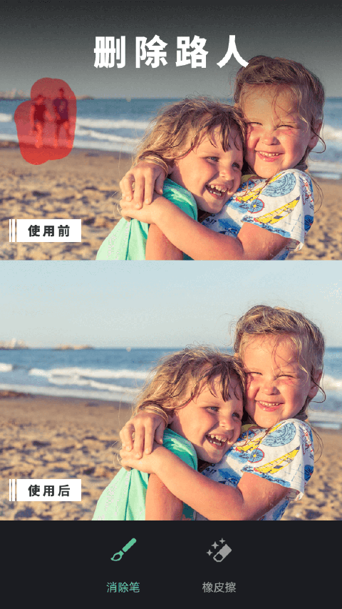 3、删除物体:拍照担心被乱入?照片有水印?垃圾桶路标不美观?皮肤有瑕疵? 不用担心,删除物体,可以删除(retouch)你认为破坏照片美观的任何对象。