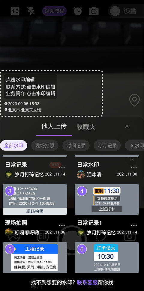 工作、抗疫、时间、地点、经纬度、海拔、天气、心情、打卡、工程、巡逻等多样化模板,真实还原工作及生活的需求,同时满足用户对水印相机不同场景模板的需求。