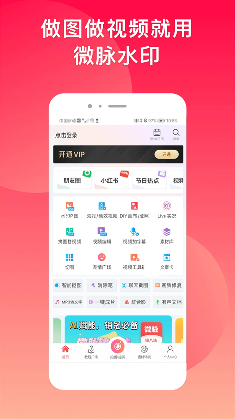2、海报大片:不用花钱找设计师,分分钟设计出自己的海报,只需修改图片和文字,海报主题针对微商经营场景设计,支持添加图片抠图、翻转照片、支持上传视频、添加视频声音等;