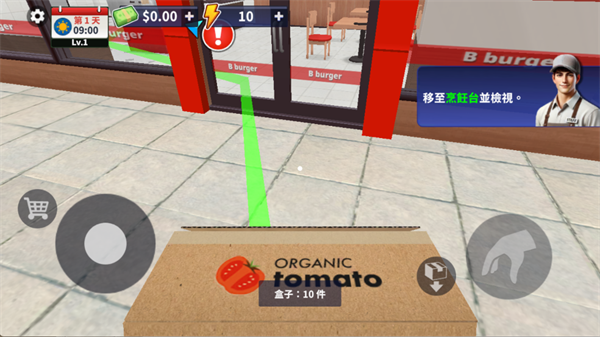 购买物资后,快递小哥会放到店铺门口,靠近物资箱时,将圆点对准箱子,会出现交互按钮,点击即可拿起物品。