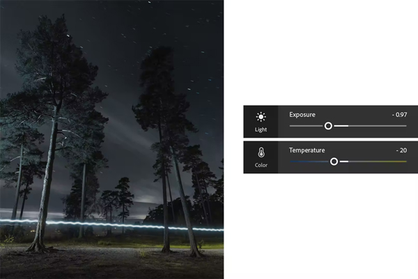 降低曝光度和温度以创建黑暗、凉爽的场景。