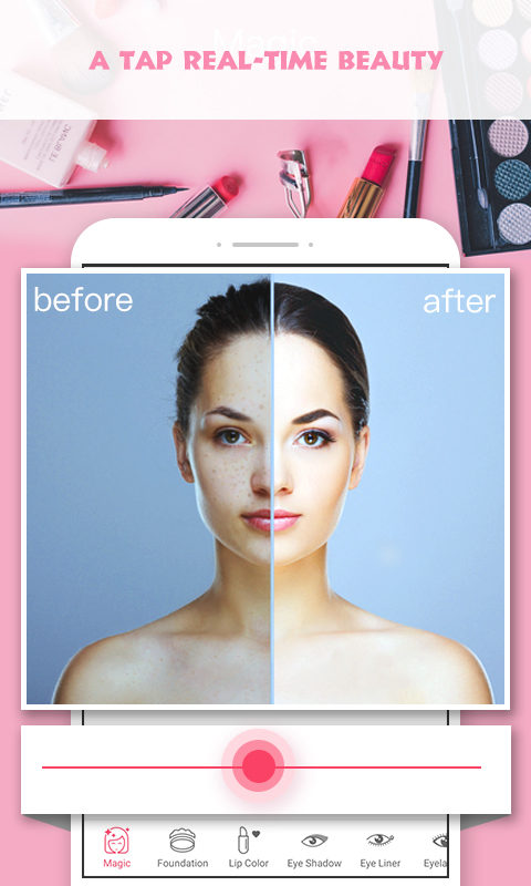 智能识别技术让真实妆容随着妳的脸部移动上妆。随性玩妆,妆感服贴