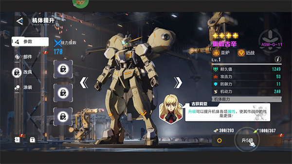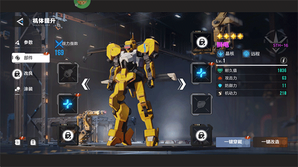 5、进入到机体界面,对上阵的机体进行培养,先一键升级,然后一键穿戴各种部件,再对部件进行改造,接着再使用同名机体碎片进行改良来提升品质。