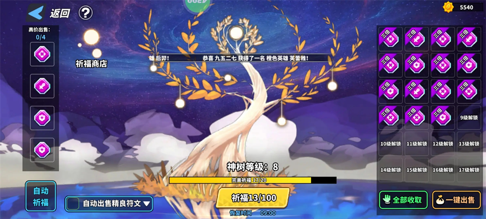 神树祈福获得的符文我们可以通过分解来得到神树币,神树币可以通过神树商店购买我们所需要的东西,最重要的红色史诗符文就能从商店购买得到。祈福所得到的符文每天都会有四种可以高价出售,这个就是获取神树币最快的途径了。切记!不要点自动出售精良符文,因为高价出售不是只能出售一个,你可以把高价的都留着,不去分解也不收取,等把高价符文都占满格子后再一键出售,这样满格子的情况下,你能获得三倍的收益。