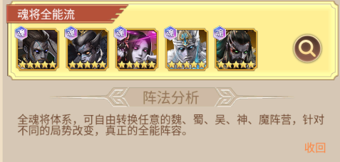 全魂将体系,可自由转换任意的魏、蜀、吴、神、魔阵营,针对不同的局势改变,真正的全能阵容。