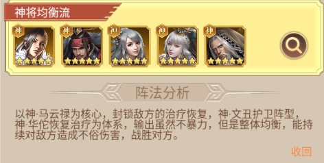 以神·马云禄为核心,封锁敌方的治疗恢复,神·文丑护卫阵型,神·华佗恢复治疗为体系,输出虽然不暴力,但整体均衡,能持续对敌方造成不俗伤害,战胜对方。
