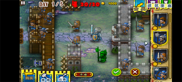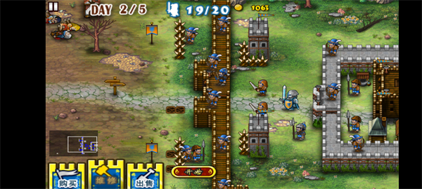 6、每次战斗后可通过“维修”功能修复受损建筑,同时用获得的金币补充士兵、升级防线。