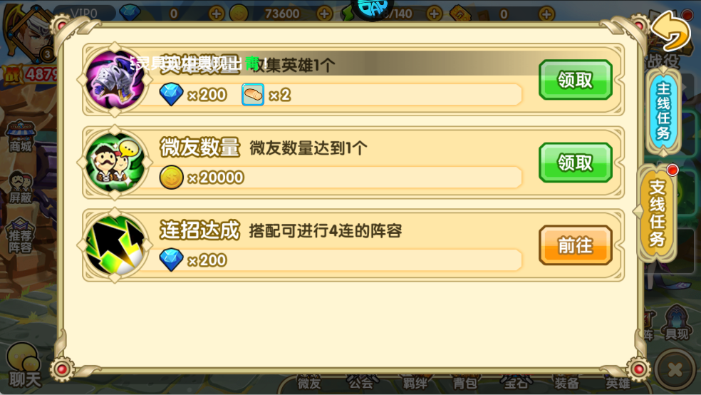 支线任务:收集英雄、加微友可领钻石、金币。