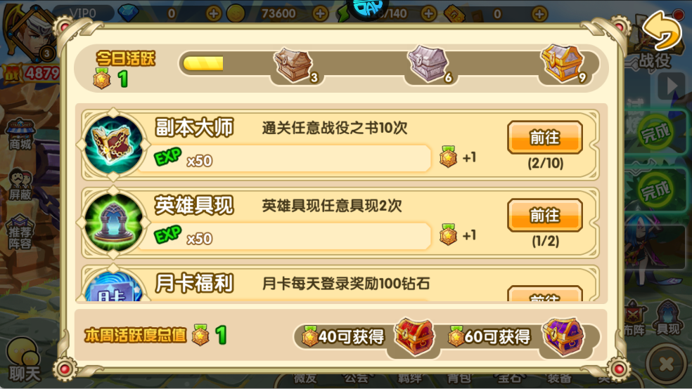 活跃度任务:通关战役、英雄具现得 EXP 和活跃度,累计活跃度能开宝箱。
