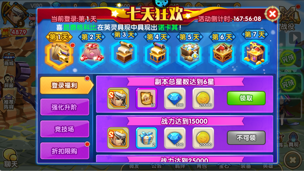 游戏内 “精彩活动”“七天狂欢” 等活动会定期 / 永久开放,完成对应目标(如战力、副本星数)可领钻石、英雄碎片等资源。