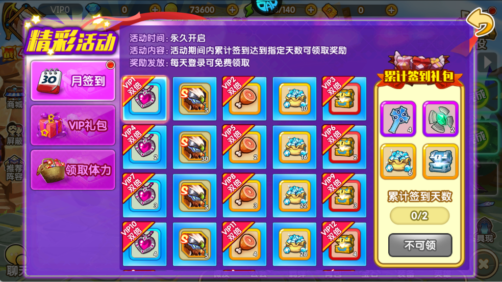 累计签到得 VIP 道具、资源,达成指定天数还能领累计签到礼包。