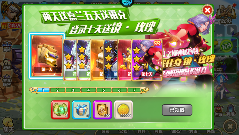 7 天登录:第 2 天得嘉兰、第 5 天得雷克、第 7 天得 SS 级镜・玫瑰。