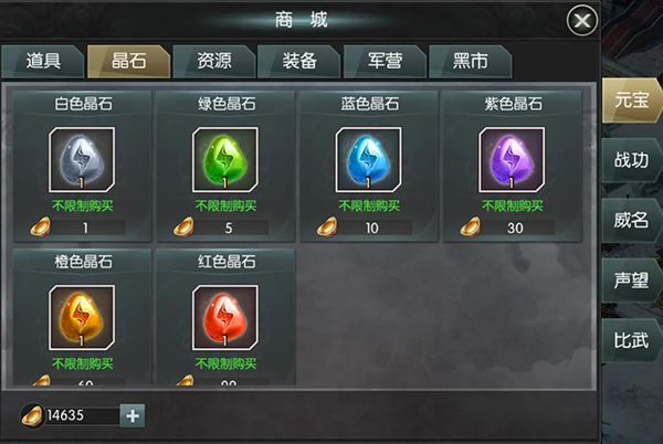 【商城】→【元宝】→【晶石】