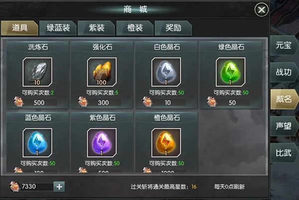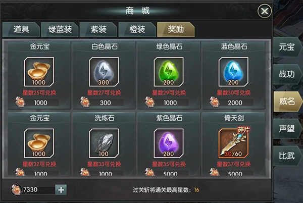 过关斩将的星数达到27以上还可以使用威名兑换大量晶石,不同颜色晶石需要的星数不同