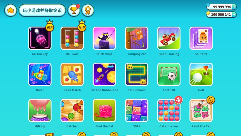 3、有30多个有趣的小游戏可以为你提供食物和金币,你可以用这些金币为你的虚拟宠物猫买东西;
