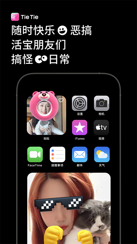 贴贴tietie是一款超级有趣的拍照软件,也叫贴贴TieTie,软件界面直观,功能丰富,有了它就可以随时随地和朋友们分享日常了,而且使用方法也非常简单,双指在桌面捏合,返回桌面,添加贴贴小组件到屏幕,接收来自好友的分享,然后点击添加工具,将贴贴直接拖入桌面即可。