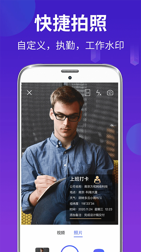 支持现场摄影,视频拍摄实时GPS定位,自动添加地址、时间、日期、经纬度、海拔、天气等水印。