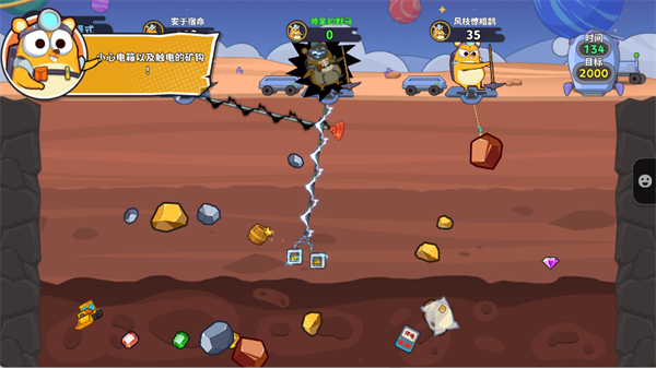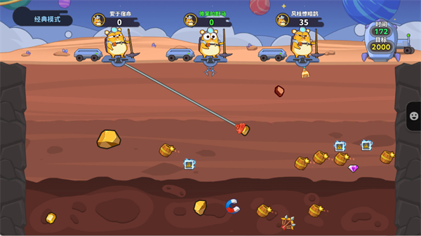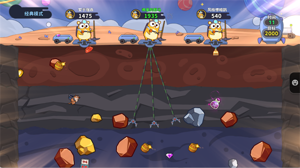 4、进入对局后,玩家将同时置身于同一矿场,通过操控钩子抓取矿石、道具和金币,在限定时间内率先达到目标分数或取得最高分的玩家获胜,右上角会实时显示胜利目标进度。