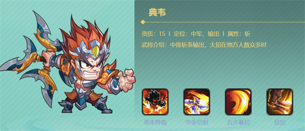 凶勐的中排斩系输出,「恶来降临」能在敌方人数众多时造成恐怖的群体伤害,「夺命切割」和「五步暴起」的连招,让他成为团战中的绞肉机。