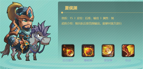 沉稳老练的骑兵队后排炮手,「定点轰炸」和「爆破弹」能对敌方阵地进行范围打击,「机动」技能让他在保持输出的同时,拥有出色的躲避能力。