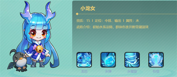 萌系水系法师,「龙怒」和「水螺旋」能造成群体伤害并附加潮湿效果,配合队友的火系技能可触发爆炸伤害,是队伍里的“元素发动机”。