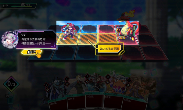 7、连招示例:左键依次打出三张牌造成40点伤害,右键弃牌冲刺规避伤害,最后按空格结束回合。
